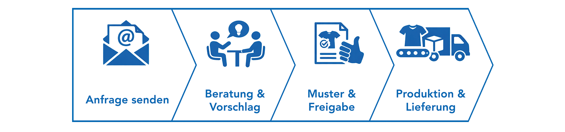 Unser Logoservice ist einfach und effizient aufgebaut: Sie senden Ihre Anfrage, erhalten eine persönliche Beratung, prüfen ein Muster und anschließend erfolgt die Produktion Ihrer Arbeitskleidung mit Logo.